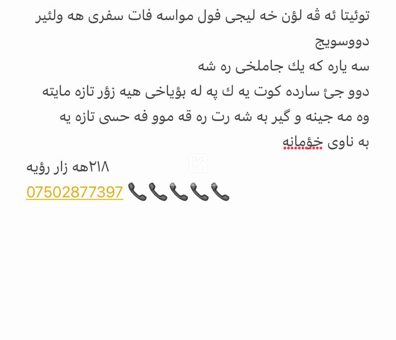 توئيتا ئه ڤه لؤن خه ليجى فول مواسه فات سفرى هه ولئير دووسويج سه ياره كه يك جاملخى ره شه دوو جئ سارده كوت يه ك په له بؤياخى هيه زؤر تازه مايته وه مه جينه و گير به شه رت ره قه موو فه حسى تازه يه به ناوى خؤمانه ٢١٨هه زار رؤيه 07502877397 📞📞📞📞📞